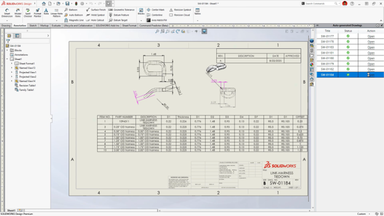 Accélérez la création de mises en plan avec des vues et des symboles de perçage optimisés par l'IA, ainsi que des fonctions automatisées de cotation, d'habillage, de sélection de format de feuille et de mise à l'échelle.